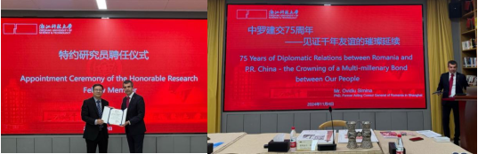 下午,西米那博士受聘为我校罗马尼亚研究中心特约研究员,并举行了聘任仪式。随后,他为我校师生开展了题为“75 years of diplomatic relations between Romania and P.R. China - the crowning of a multi-millenary bond between our people(中罗建交75周年——见证千年友谊的璀璨延续)”的讲座,通过历史发展的视角,展现了罗马尼亚与中国之间延续千年的深厚友谊与联系,以及两国之间长期的友好外交关系。