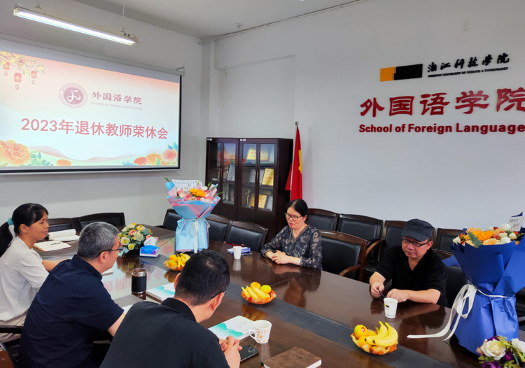 9月21日上午,外国语海角社区举办2023年退休教师荣休会,为荣退的老师们送上美好的祝福。荣休教师叶依群、何小聪、院长樊燕龙、总支副书记兼副院长方小卿及分工会委员、海角社区办公室人员出席,会议由总支书记丁炳泉主持。